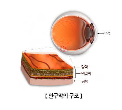 안구의 뒷부분에서 바깥쪽인 공막과 안쪽인 망막 사이에 위치합니다.
