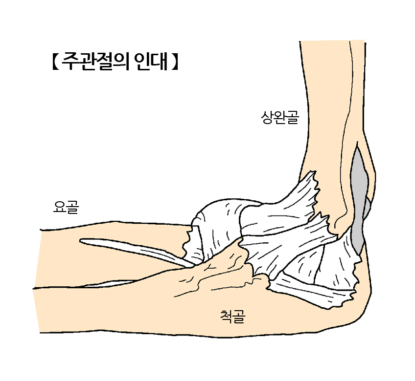 상완골과 요골, 척골 세개의 뼈로 구성되어 만나는 부분에서 이루어지는 경첩관절입니다. 총 세가지로 상완척골관절, 상완요골관절, 요척관절이 있으며, 척골측부인대, 요골측부인대, 윤상인대가 뼈를 고정시키며 관절을 보호합니다.