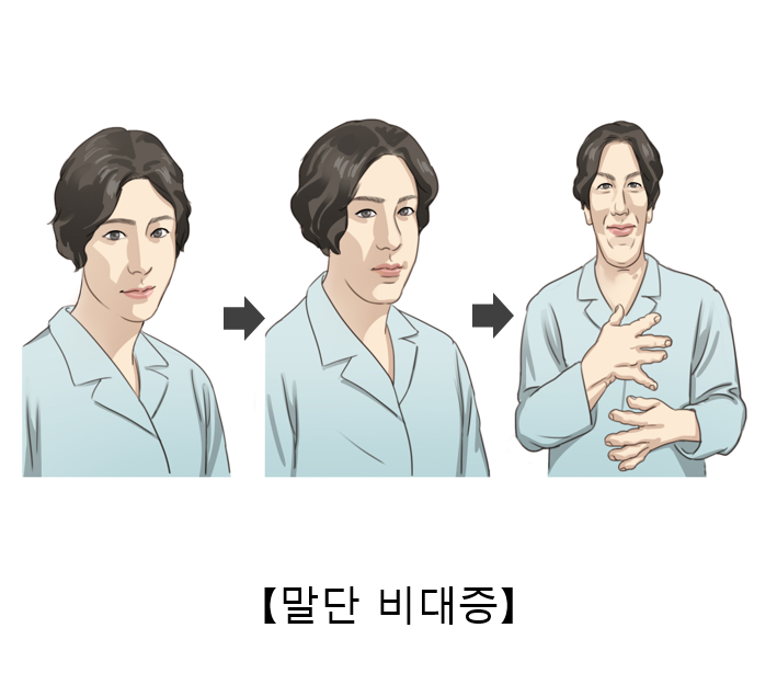 성인이 된 후에 성장호르몬이 과다하게 분비되면 손끝, 발끝 등 신체의 말단 부위가 커지고 두꺼워지는 말단 비대증이 나타납니다.