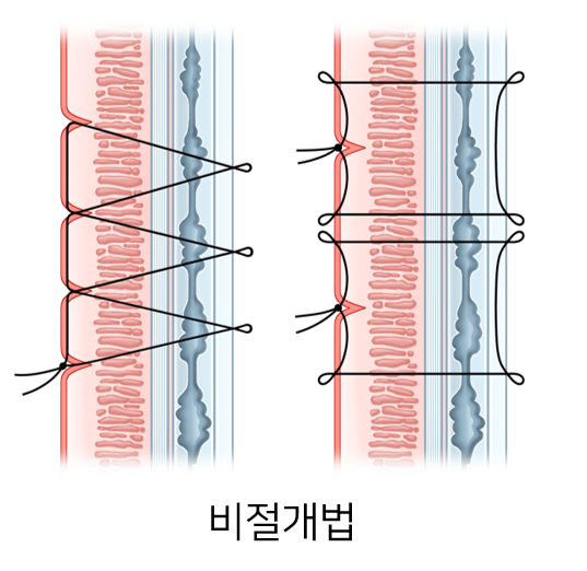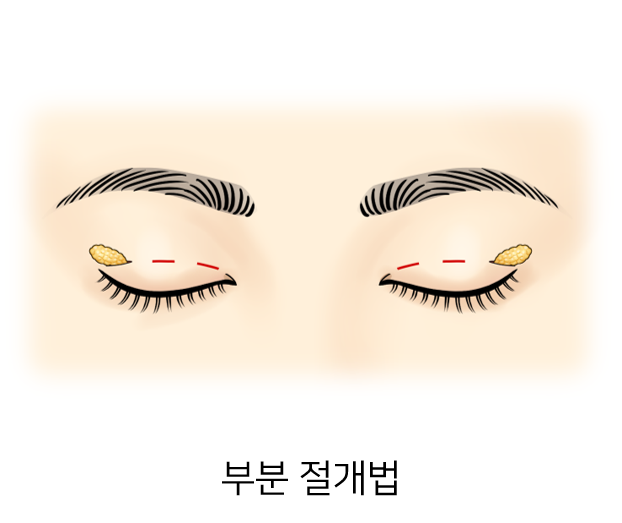 쌍꺼풀 수술은 일반적으로 국소 마취로 시술하며, 필요에 따라서는 진정제를 사용합니다. 쌍꺼풀 수술은 피부에 절개를 하는 방법(절개법)과 절개를 하지 않는 방법(매몰법)이 있습니다. 절개법은 눈꺼풀 피부에 절개를 하여 일부 근육과 피부를 절제하고 쌍꺼풀 선을 만들어 줍니다.필요한 경우 지방을 제거할 수도 있는 장점이 있지만 절개선을 따라 약간의 수술 반흔이 남을 수 있습니다. 그러나 이 반흔은 시간이 지남에 따라 호전되며 눈을 뜨면 쌍꺼풀 선에 가려지게 되므로 큰 문제는 없습니다.