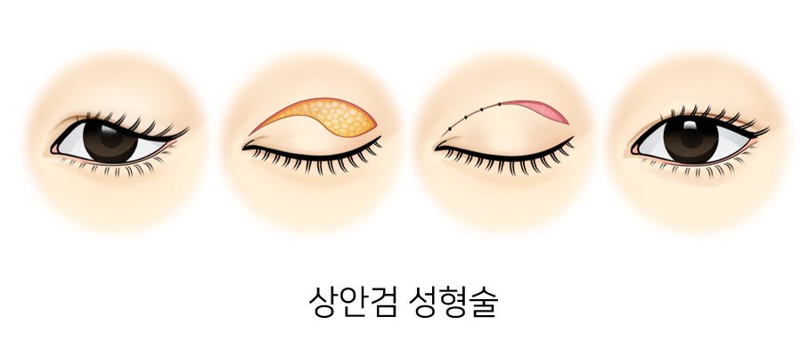 상안검 성형술은 이렇게 늘어지고 처진 윗눈꺼풀, 눈 주위 지방이 튀어나와 보이는 변형을 교정하는 수술로, 눈의 자연스런 주름선을 따라 절개선을 그리고 필요한 만큼의 피부와 근육, 지방을 제거합니다. 피부만 처진 경우, 근육이 심하게 처진 경우, 지방이 과다하여 불룩한 경우 등 다양한 양상에 대하여 정확하게 진단하고 적절한 방법으로 수술하는 것이 중요합니다. 눈꺼풀이 처진 이유가 안검 하수 때문인 경우에는 이에 대한 교정이 필요합니다. 이 수술은 국소마취로 시행하며 수술 후 4일 전후로 봉합실을 제거합니다.