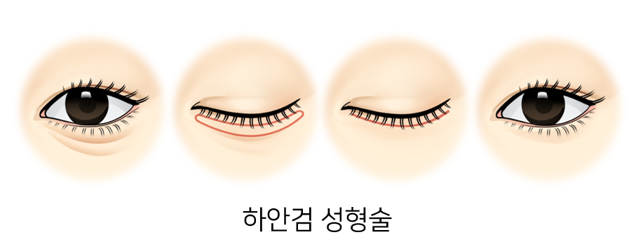 아래 눈꺼풀도 피부가 얇아지고 근육이 느슨해지며 처지고, 안와 지방을 받치고 있는 안와 격막이 약해지며 지방이 앞으로 밀려나와 눈 아래에 보기 싫은 불룩한 주머니가 나타납니다. 하안검 성형술은 여분의 지방을 제거하거나 지방이 부족한 부위에 재배치하고 안와격 막을 팽팽하게 당겨주고, 피부와 근육이 늘어진 것을 제거해 주는 수술입니다.