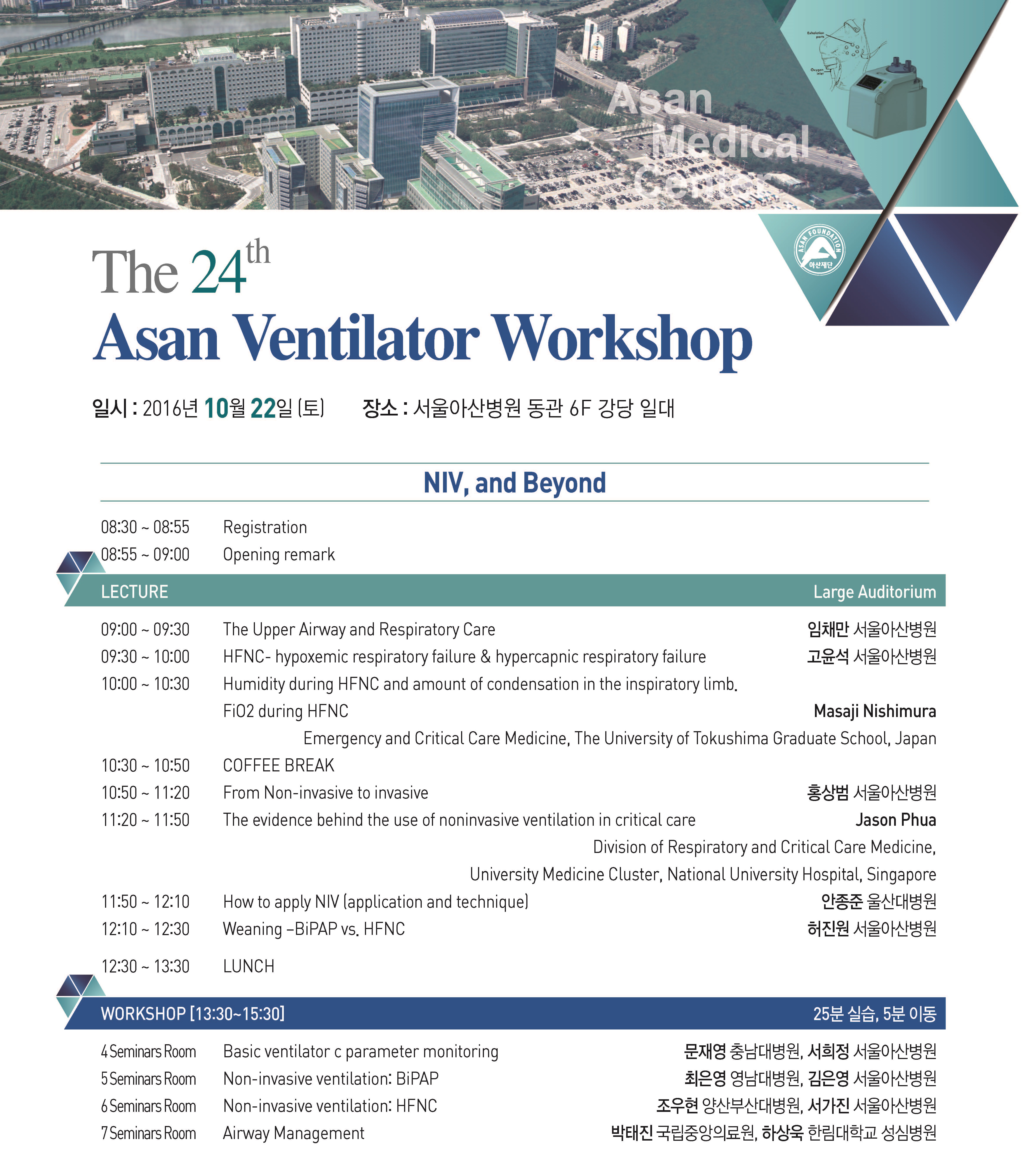 올해로 24번째 진행하는 The 24th Asan Ventilator Workshop 을 개최 합니다.