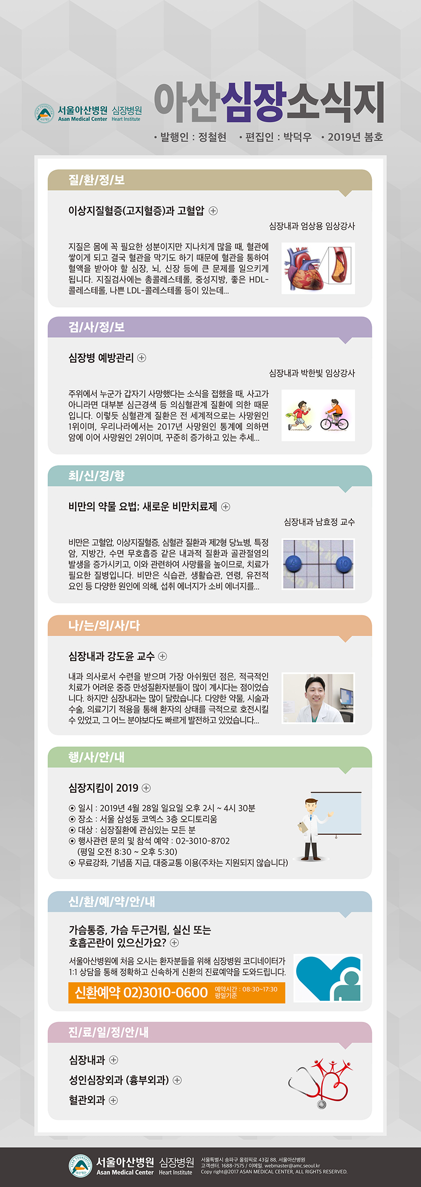 [아산심장소식지] 2019년 봄호 '이상지질혈증(고지혈증)과 고혈압'