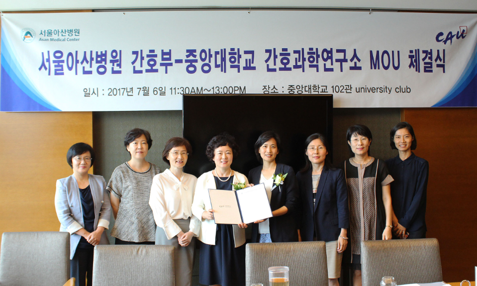 서울아산병원 간호부는 7월 6일 중앙대학교 서울캠퍼스 102관(R&D 센터)에서 중앙대 간호대학과 연구 활성화를 위한 협력 교류 협약‘을 체결했다. 이날 서울아산병원 김연희 간호부원장, 중앙대 간호과학연구소 장숙랑 소장 등 양 기관의 주요 관계자들이 참석해 연구협력체계 구축 및 연구활동 활성화를 위한 연구교류 협조를 합의했다 .