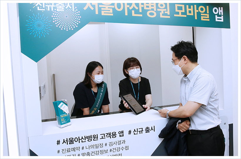 ‘서울아산병원’ 앱을 설치하기 위해 병원 동관 1층 고객용 모바일 앱 홍보부스를 찾은 70대 오 모씨, 권 모씨 부부는 “서울아산병원을 8년째 다니면서 진료예약을 하거나 건강정보를 확인할 때마다 모바일 앱을 자주 이용해왔다”면서,
