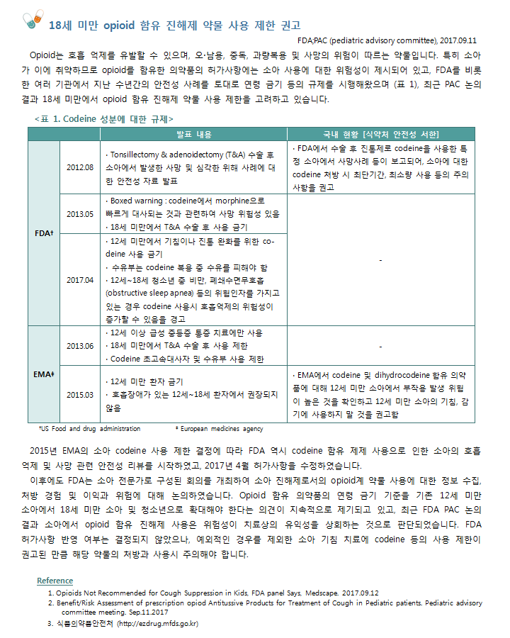 18세 미만 opioid 함유 진해제 약물 사용 제한 권고