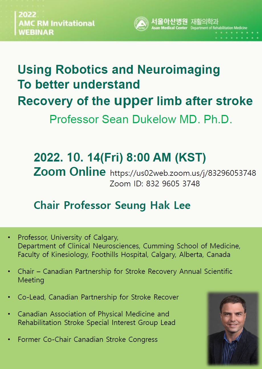 | (Webinar) 해외연자 초청강의 : Using Pobotics and Neuroimaging To better understand Recovery of the upper limb after stroke (Professor Sean Dukelow : University of Calgary, Department of Clinical Neurosciences, Cumming School of Medicine, Faculty of Kinesiology, Foothills Hospital, Calgary, Alberta, Canada) | ||