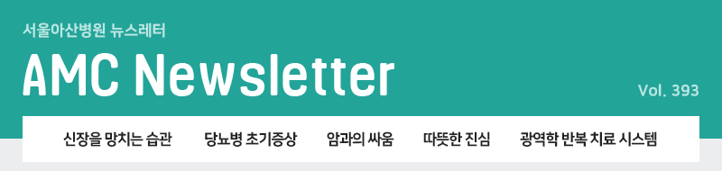 당신도 '신장'을 망가트리고 있지 않나요? 꼭 체크해야 할 당뇨병 초기증상 세 가지! 암과의 싸움, 공감하며 함께 이겨내야죠 바늘 끝에 따뜻한 진심을 담고 싶어요 식도암 표적치료 신기술… 스텐트 이용한 ‘광역학 반복 치료 시스템’ 개발 서울아산병원 페이스북 바로가기 서울아산병원 인스타그램 바로가기 서울아산병원 유튜브 바로가기 서울아산병원 네이버 블로그 바로가기 서울아산병원 트위터 바로가기 서울아산병원 네이버 TV 바로가기 서울아산병원 카카오스토리 바로가기 서울아산병원 네이버 포스트 바로가기 서울아산병원 카카오 TV 바로가기 콘텐츠 제공 신청 건강정보메일 구독하기 지난 건강정보메일 보기 서울아산병원 홈페이지 회원정보수정 바로가기 수신거부 서울아산병원