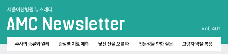 주사 맞고 문지르면 안 되는 이유, 알고 계셨나요? SPECT/CT를 활용한 엄지손가락 기저 관절염 치료 예측 처음 만난, 낯선 산을 오를 때 전문성을 향한 질문, 해외연수에서 답을 찾다 고령자 약물 6개월 이상 복용하면 골절 위험 43% 증가 서울아산병원 페이스북 바로가기 서울아산병원 인스타그램 바로가기 서울아산병원 유튜브 바로가기 서울아산병원 네이버 블로그 바로가기 서울아산병원 트위터 바로가기 서울아산병원 네이버 TV 바로가기 서울아산병원 카카오스토리 바로가기 서울아산병원 네이버 포스트 바로가기 서울아산병원 카카오 TV 바로가기 콘텐츠 제공 신청 건강정보메일 구독하기 지난 건강정보메일 보기 서울아산병원 홈페이지 회원정보수정 바로가기 수신거부 서울아산병원