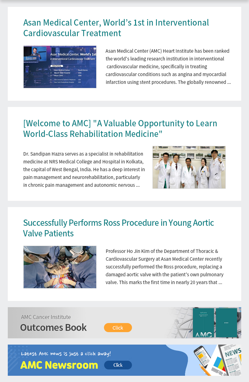 Asan Medical Center, WorldĄŻs 1st in Interventional Cardiovascular Treatment [Welcome to AMC] A Valuable Opportunity to Learn World-Class Rehabilitation Medicine Successfully Performs Ross Procedure in Young Aortic Valve Patients AMC Cancer Institute Outcomes Book ASAN MEDICAL CENTER NEWSROOM Homepage Facebook instagram youtube linkedin ASAN International Visiting Scholars(IViS) Program Appointment Contact Details Subscribe Unsubscribe