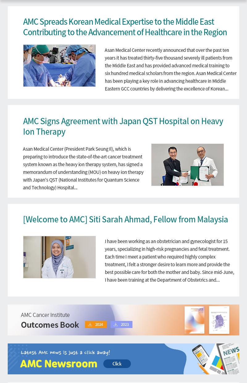 AMC Spreads Korean Medical Expertise to the Middle East AMC Signs Agreement with Japan QST Hospital on Heavy Ion Therapy [Welcome to AMC] Siti Sarah Ahmad, Fellow from Malaysia 2024 Outcomesbook ´Ù¿î·Îµå 2023 Outcomesbook ´Ù¿î·Îµå ASAN MEDICAL CENTER NEWSROOM Homepage Facebook instagram youtube linkedin ASAN International Visiting Scholars(IViS) Program Appointment Contact Details Subscribe Unsubscribe